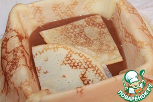 Затем снова начинка и блинчики в противоположные углы, и так до самого верха формы.