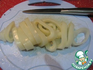 Размораживаем кальмары, опускаем в горячую воду и снимаем самую тонкую прозрачную пленку. Режем кольцами по 1 см.