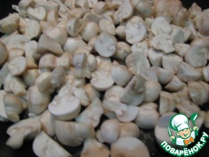 Моем шампиньоны, промокаем бумажным полотенцем, и в зависимости от размера нарезаем на части (не мелко)