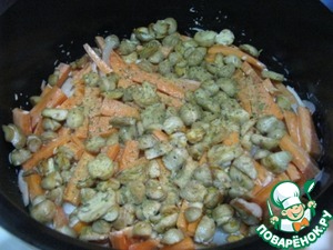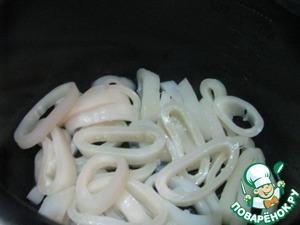 Смазываем чашу сливочным маслом и укладываем слоями. Сначала кальмары
