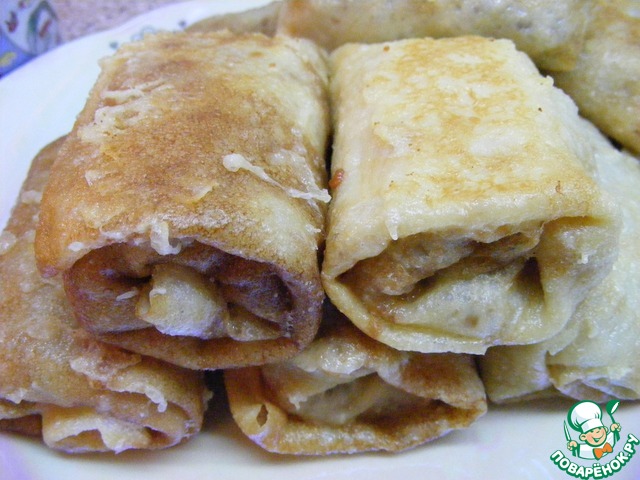 Блинчики жарятся во фритюре, при этом они герметично запечатываются, покрываются хрустящей корочкой и становятся похожими на пирожок.