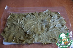 На пищевую пленку раскладываем виноградные листья. Я использовала квашенные листья. Раскладываем внахлест и в несколько слоев для надежности.