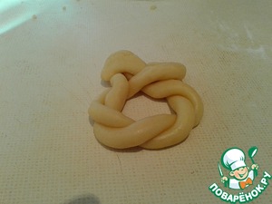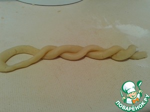Отрываем кусочек тесто, разминаем в руках и вылепливаем длинный жгутик.