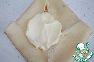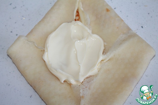 В центр кладем 1 ч. л. сливочного сыра. Можно брать любой сладкий сливочный сыр. Можно и без него, но с ним вкуснее.