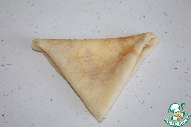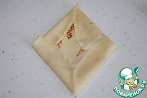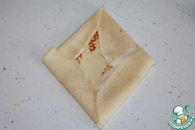 Складываем. Выкладываем на тарелку и поливаем соусом.