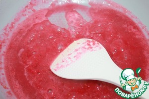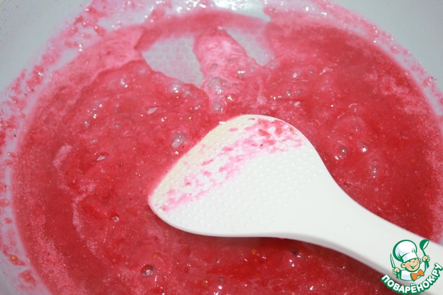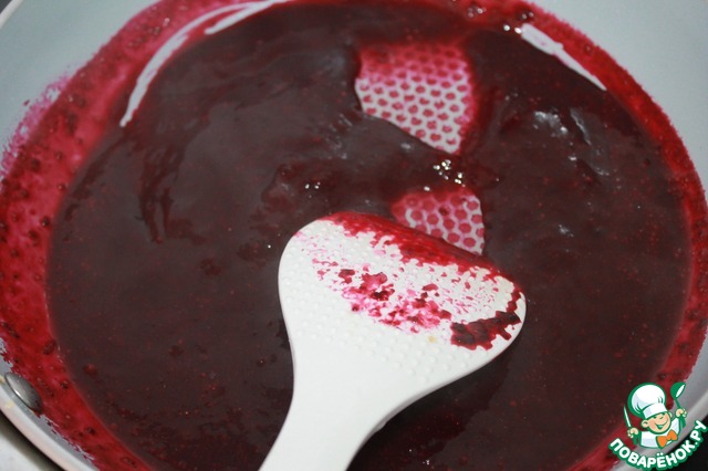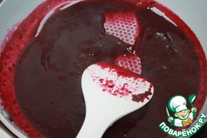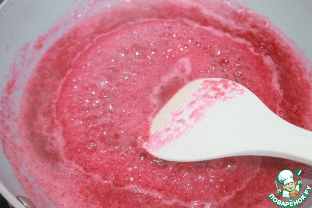 Выкладываем пюре из красной смородины, добавляем немного воды, примерно 100 мл, 2 ст. л. сахара (можно больше или меньше). Доводим до кипения, растворяем сахар.