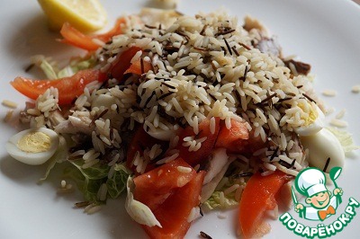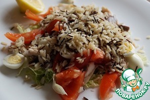 Предлагаю вам сочный, легкий и сытный салат из отварной на пару рыбы, риса и сочных овощей. Приправленный лимоном и оливковым маслом - идеальный вариант для следящих за своей фигурой.