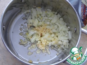 Почистите лук чеснок и имбирь. Лук мелко нарежьте, а чеснок и имбирь пропустите через чеснокодавку. Разогрейте масло в той кастрюле, в которой будет вариться суп. Выложите туда лук с чесноком и имбирем, пассеруйте до прозрачности лука.