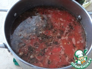 Добавьте помидоры вместе соком. Если вы используете целые помидоры, то предварительно их порежьте. Накройте крышкой и варите минут 35. Минут за 10 до готовности посолите и поперчите (горошины перца размолоть или растолочь).