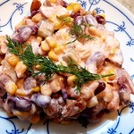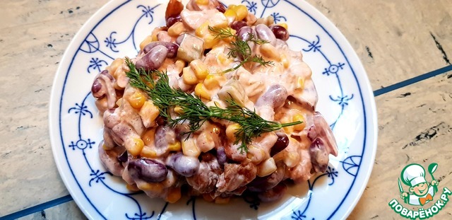 Все высыпать в салатницу и перемешать. Добавить сухарики и заправить майонезом.