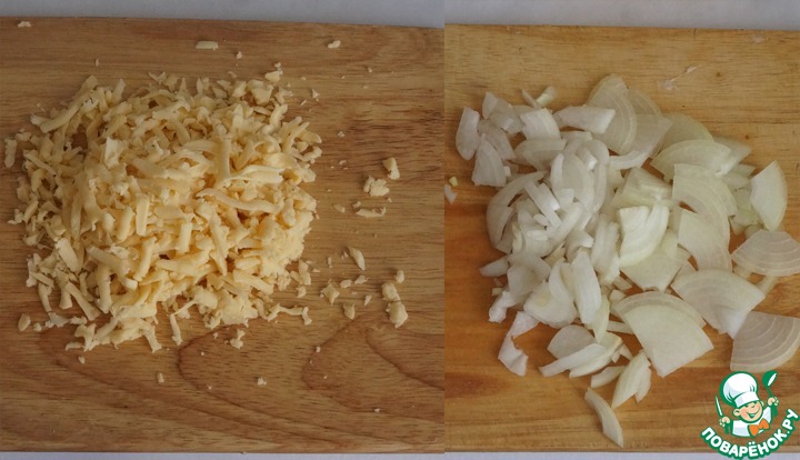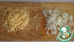 Сыр натираем на крупной терке. Лук нарезаем не длинной соломкой.