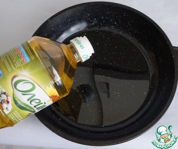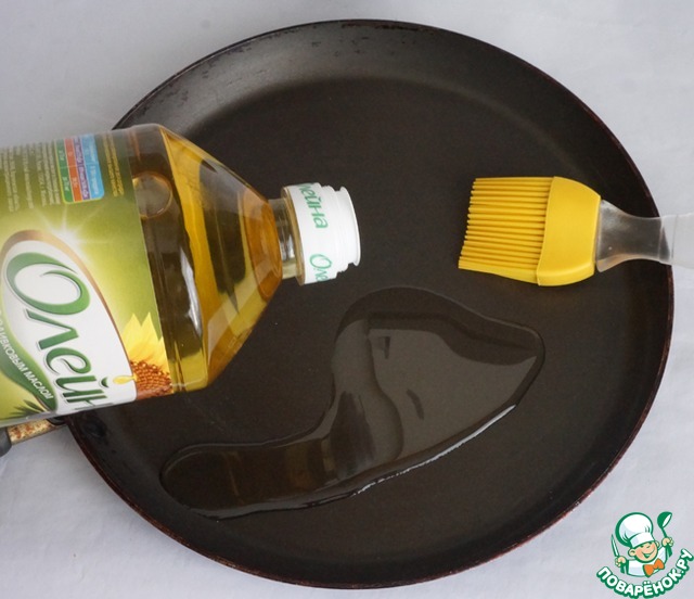 Пока начинка охлаждается, разогреваем сковороду для блинов, смазываем её растительным маслом