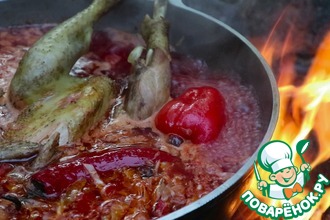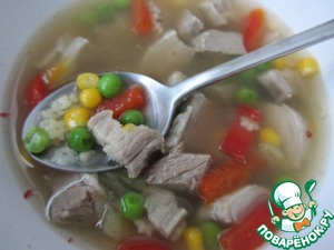 В охлажденный и процеженный бульон из баранины всыпать кукурузу и перец, не оттаивая их. Довести до кипения на сильном огне.