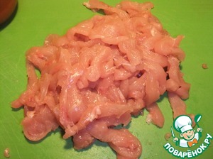 Филе режем тоненькой соломкой ( удобнее, когда филе подморожено)