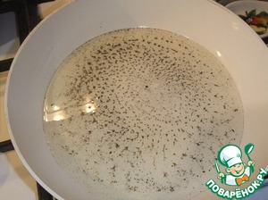 Прогреваем сковородку, наливаем немного растительного масла, насыпаем свежемолотый черный перец, ждем когда масло закипит (по перцу видно)