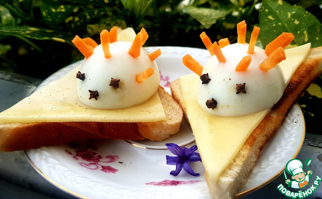 Яйцо сварите, очистите и разрежьте пополам. Морковь нарежьте соломкой. Cоломку ещё разрежьте, это будут "колючки" ёжика.