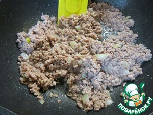 Добавить фарш и, тщательно перемешивая, обжарить вместе с луком. Добавить кусочек сливочного масла, все перемешать и хорошо прогреть, пока масло не разойдется.