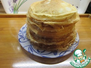 В чашку (окружность чашки должна соответствовать окружности блинов) укладываем блин, на него слой крема, далее чередуем слои блинов и крема.