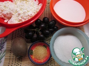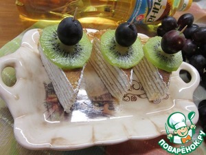 Сверху укладываем ломтик киви и закрепляем зубочисткой с виноградинкой.