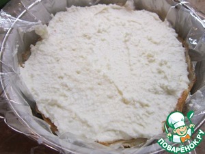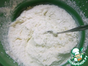 Остывшие сливки, процеживая, выливаем в творог и все взбиваем блендером.