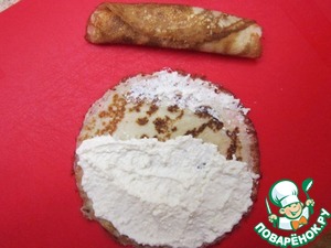Свернуть наш блинок рулетиком, начиная с толстого слоя крема.