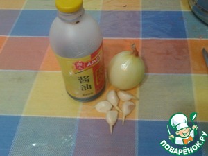 Приступим к маринаду. Подготовить чеснок, лук, соевый соус.