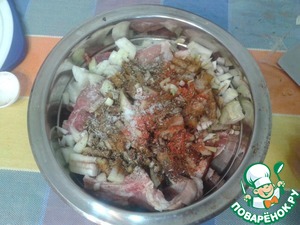 Все ингредиенты выкладываем к мясу, хорошенько перемешиваем. Можно переложить в пакет и время от времени перемешивать, можно просто оставить мариноваться в чашке, но не менее 30 минут.