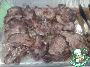 Выложить мясо на противень, желательно толстостенный. Налить на дно водички, примерно 1 стакан. Накрыть фольгой и поставить в горячую духовку на 20 минут. Так мясо не высохнет, а станет более сочным.