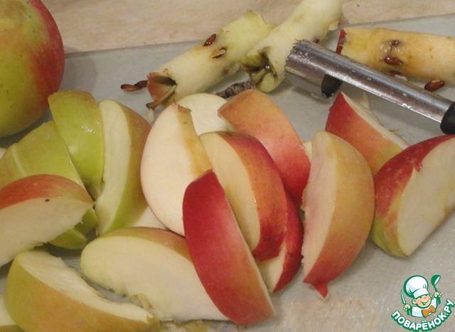 Когда утка замариновалась, готовим яблоки. Вырезаем из них середину. Разрезаем каждое примерно на 16 долек. Поливаем их лимонным соком.