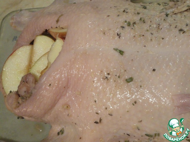 Утку фаршируем яблоками. Я, несмотря на рекомендации сильно туго ее не напихивать, нафаршировала от души, т. к. очень люблю запеченные с мясом или птицей яблоки. Зашитая на пузе кожа у моей уточки действительно разошлась, но меня это не сильно расстроило, т. к. я вдоволь потом насладилась запеченными яблоками.