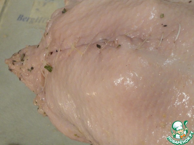 Оставшийся маринад процеживаем и отставляем пока в сторону. По возможности промакиваем маринад со шкуры. Это нужно, чтобы чеснок и травы не подгорали в процессе запекания.