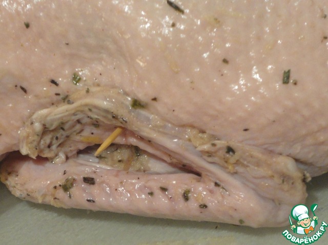 Чтобы крылья не подгорели, прикалываем их к тушке с помощью зубочисток.