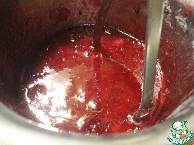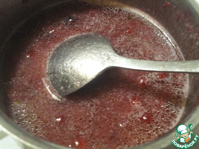 А в это время готовим кисло-сладкий клюквенный соус. С отлитого «сока» от утки снимаем сверху жир. Его будет примерно половина от «сока».