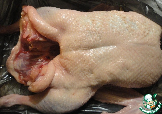 Утку тщательно осмотреть на предмет остатков перьев. Удаляем их пинцетом или можно опалить над огнем. Т. к. кожа у утки достаточно толстая, то для того, чтобы наша она (утка) хорошо промариновалась, необходимо проткнуть кожу деревянной палочкой в нескольких местах.