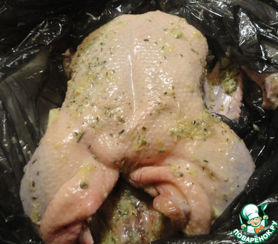 Обмазываем ее маринадом внутри и снаружи. Завязываем пакет и хорошо перетряхиваем, чтобы маринад лучше распределился по утке.