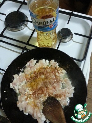 Куриную грудку нарезать на маленькие кусочки, добавить куркуму, посолить, поперчить, и обжариваем
