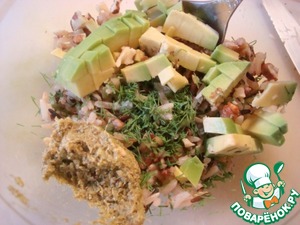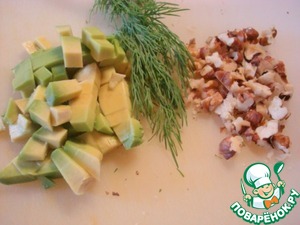 Грецкие орехи крупно порубить, авокадо порезать маленькими кубиками, укроп порубить.