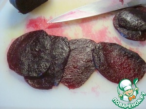 Свеклу нарезать очень тонкими пластинами (лучше слайсером), а затем формочкой вырезать ровные круги. У меня, к сожалению, слайсера нет, поэтому пришлось действовать очень острым и большим ножом. Не скажу, что идеально, но более-менее получилось.