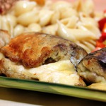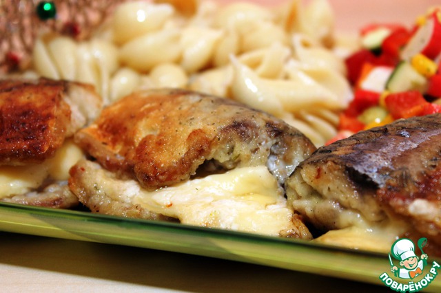 На каждый кусочек рыбы кладем - на одну половинку кусочек сыра, вторую половинку намазываем горчицей. Складываем обе половинки вместе. Так проделываем со всеми кусочками.