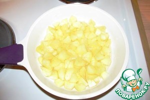 • Яблоки чистим от кожуры и семенной коробочки и нарезаем тонкими дольками. Выкладываем яблоки в сковороду, поливаем лимонным соком, засыпаем сахарной пудрой, посыпаем маленькой щепоткой соли для усиления аромата, вливаем 3 столовых ложки воды и ставим на средний огонь.