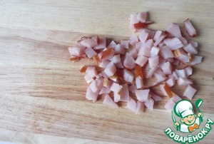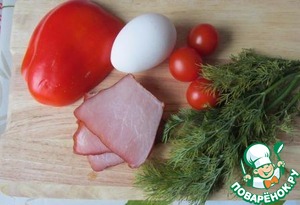 Ветчину и перец нарезаем мелкими кубиками. Помидорки разрезаем пополам.