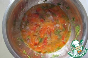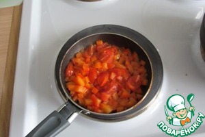 На смазанную маслом сковороду выкладываем смесь кубиков перца и кусочки помидоров, добавляем по маленькой щепотке соли и перца и тушим на среднем огне минут 10.