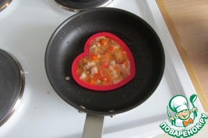 На смазанную маслом сковороду кладем формочку, в которой пекли оладьи, и выкладываем несколько столовых ложек начинки.
