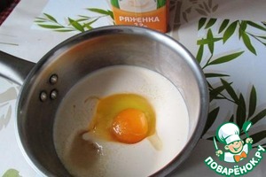 Ряженку наливаем в кастрюльку, всыпаем соль и сахар и разбиваем яйцо.