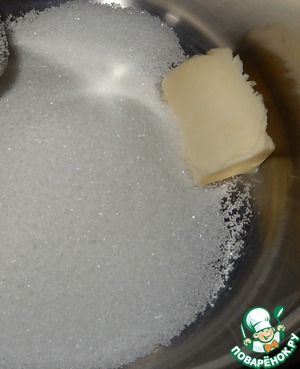 В сотейник выкладываем сахар и сливочное масло, подогреваем, пока сахар не растворится.