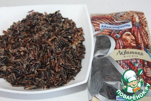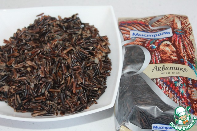 Отвариваем дикий рис Акватика Wild Rice ТМ "Мистраль" в подсоленной воде в соотношении 1:3, до раскрытия некоторых зерен. Даем воде стечь.