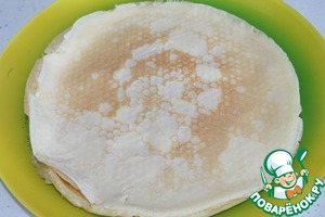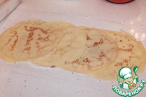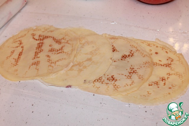 На стол выстилаем пищевую пленку. Сверху кладем 4 блина, можно меньше. Блинчики кладем немного внахлест.