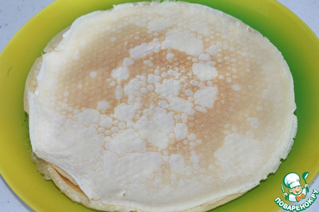 Блинчики жарим по любимому Вашему рецепту. У меня для закусочных блинчиков он такой: 500 мл. молока, 3 яйца, 150 гр. муки, 100 мл. растительного масла, соль шепотка, сахар 1 ст. л.