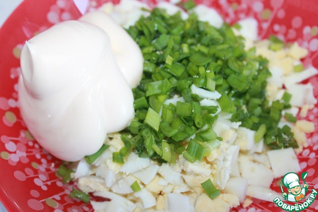Яйцо отвариваем, нарезаем. Добавляем мелко порезанный зеленый лук и сметану. Перемешиваем. Сметану можно заменить майонезом.