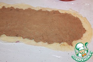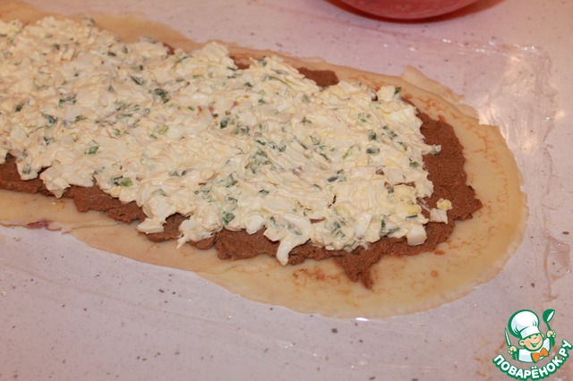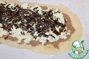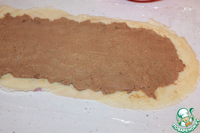 Сверху равномерно отступая по краям наносим печеночный паштет. Делать это лучше всего смоченными немного руками.